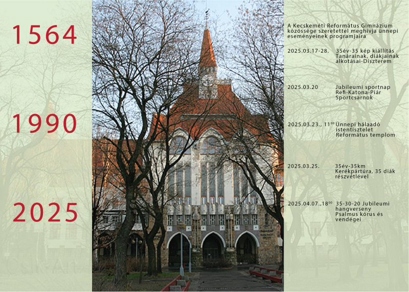 A 35 éve újraindult Kecskeméti Református Gimnázium, az alábbi program sorozattal ünnepeli ezt a jelentős évfordulót!